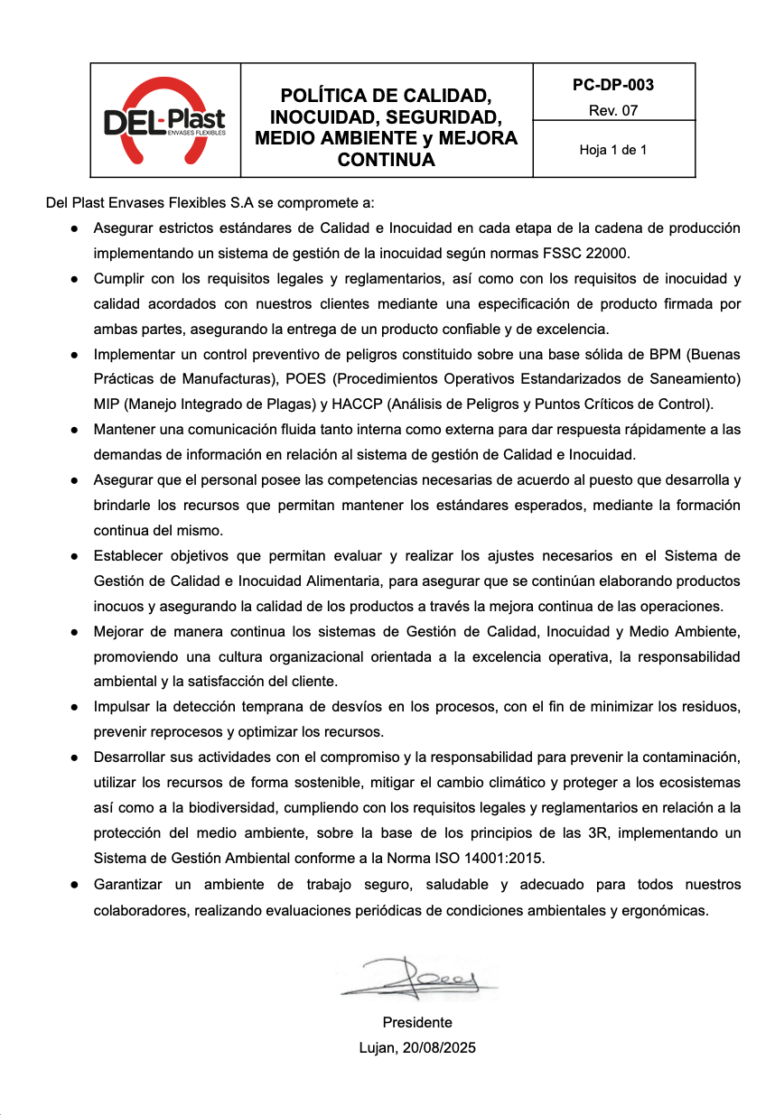 POLÍTICA DE CALIDAD (+54) 02323 430089 info@delplast.com.ar José María Pérez 977 | Luján | Buenos Aires | Argentina Seguinos en LinkedIn